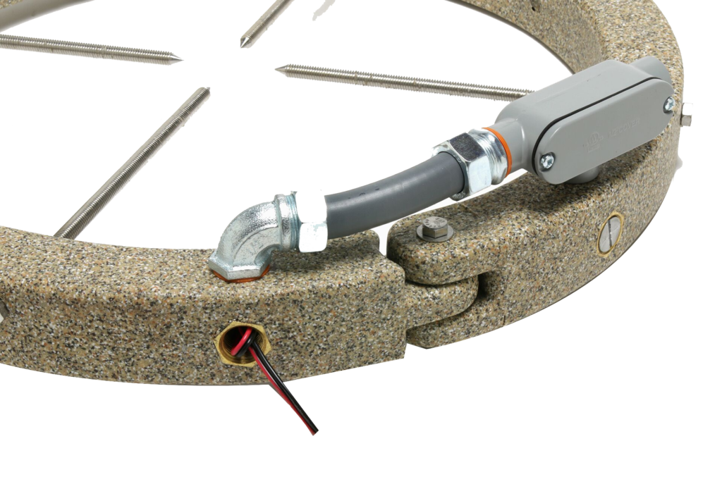 Any light fixture with a 1/2″ NPT can fit on the ring. We can wire the ring for 2-6 spotlights. Rings can be wired for 12 volt and 120 volt.